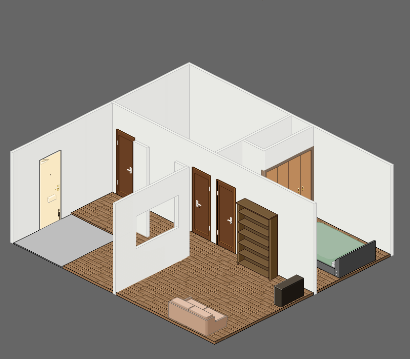 玄関ドア、玄関かまち、台所の壁(奥の壁は玄関が見えなくなるから非表示にしてあるけど、ちゃんと作った)、キッチンとリビングの間の壁に穴(カウンターつける予定)、リビングのソファ、本棚、テレビ台。